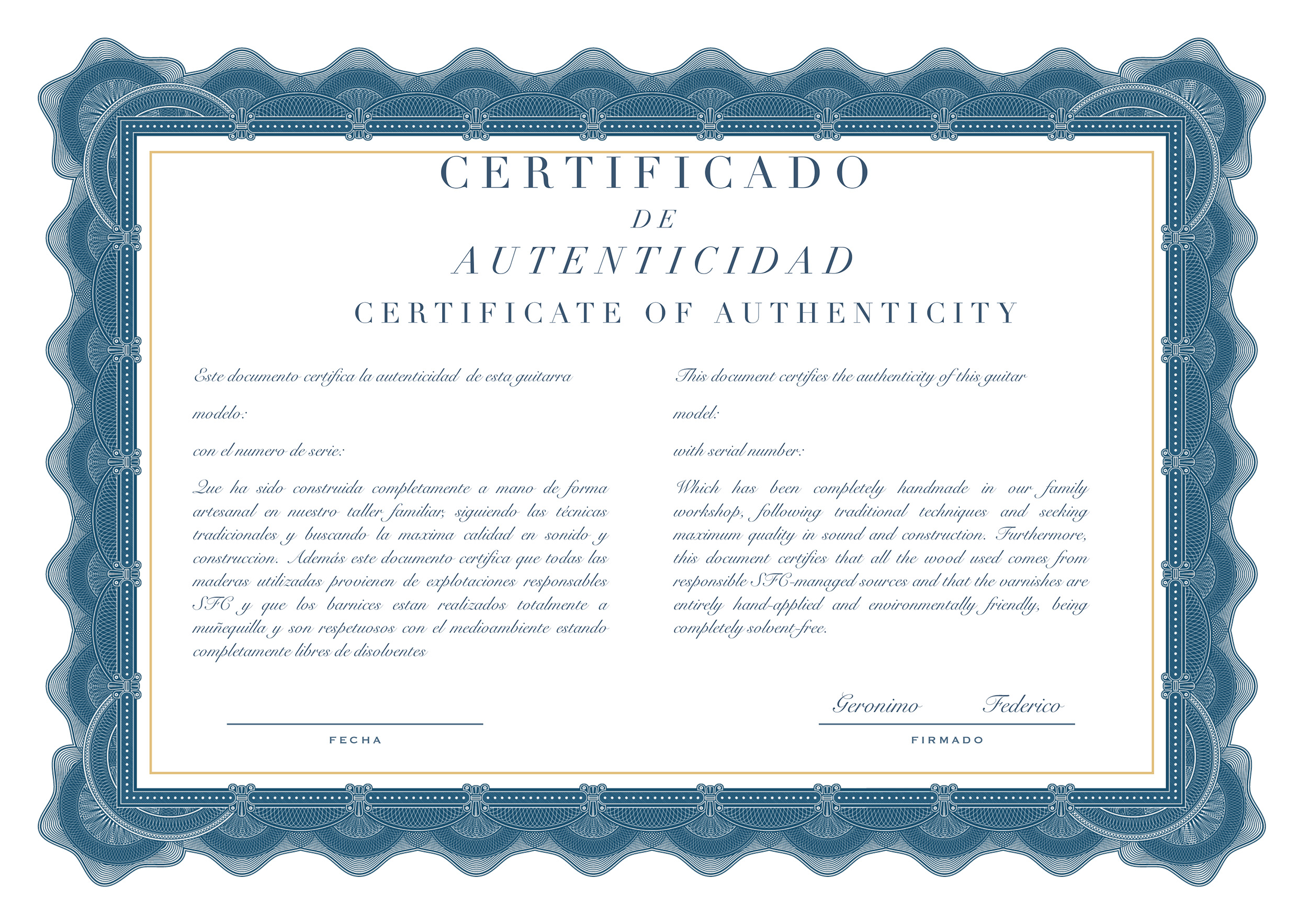 Yes. All our guitars include a certificate of authenticity and exclusivity signed by Gerónimo or Federico, with the unique serial number of your instrument. It's your guarantee that you own an irreplaceable handcrafted piece.